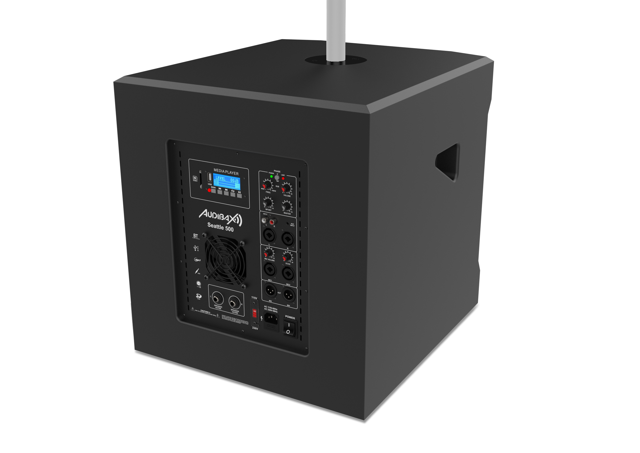 Notre Seattle 500 PA system dispose d’une entrée combo XLR / Jack gauche / droite, d’une entrée RCA symétrique, de 2 sorties XLR et de 2 sorties Speakon.