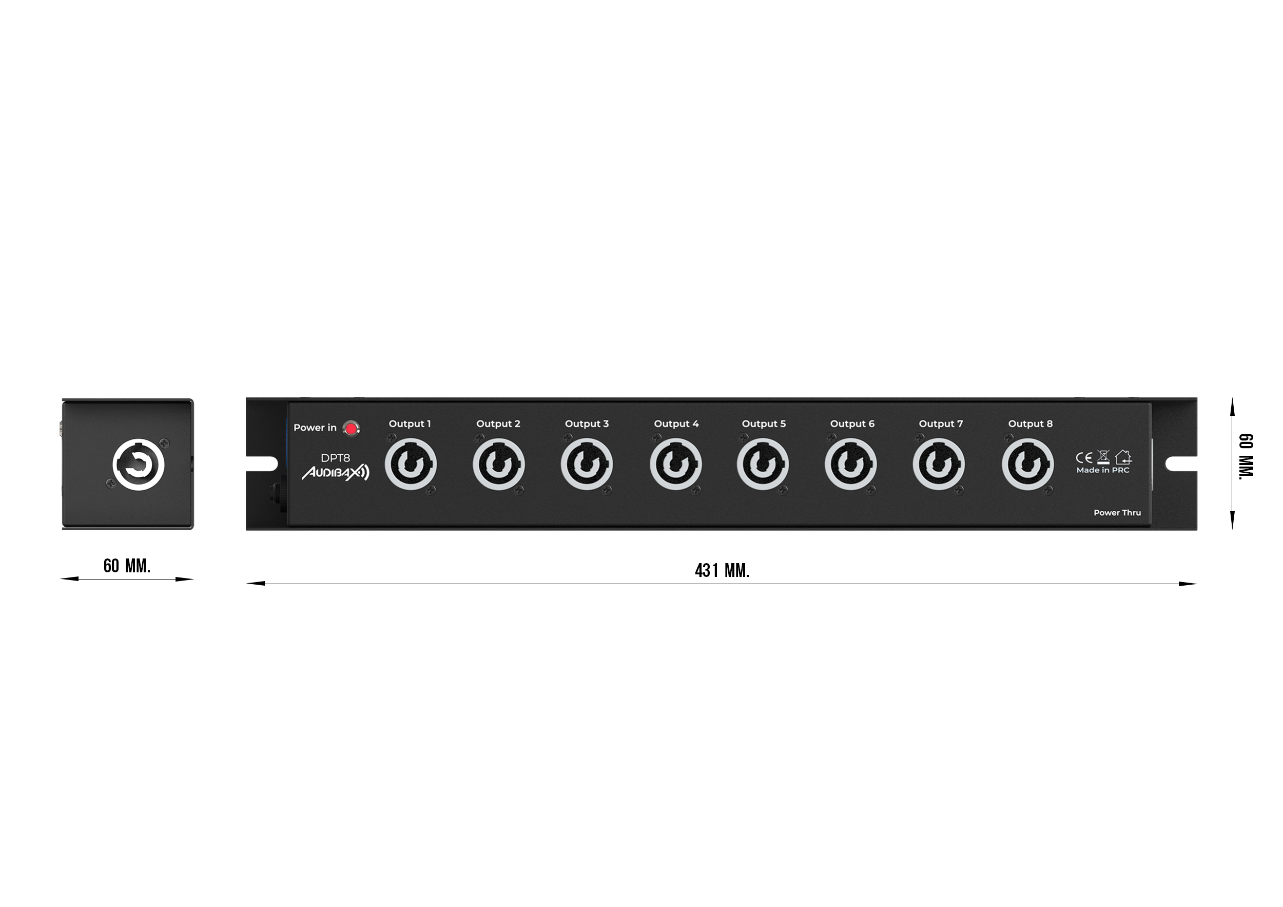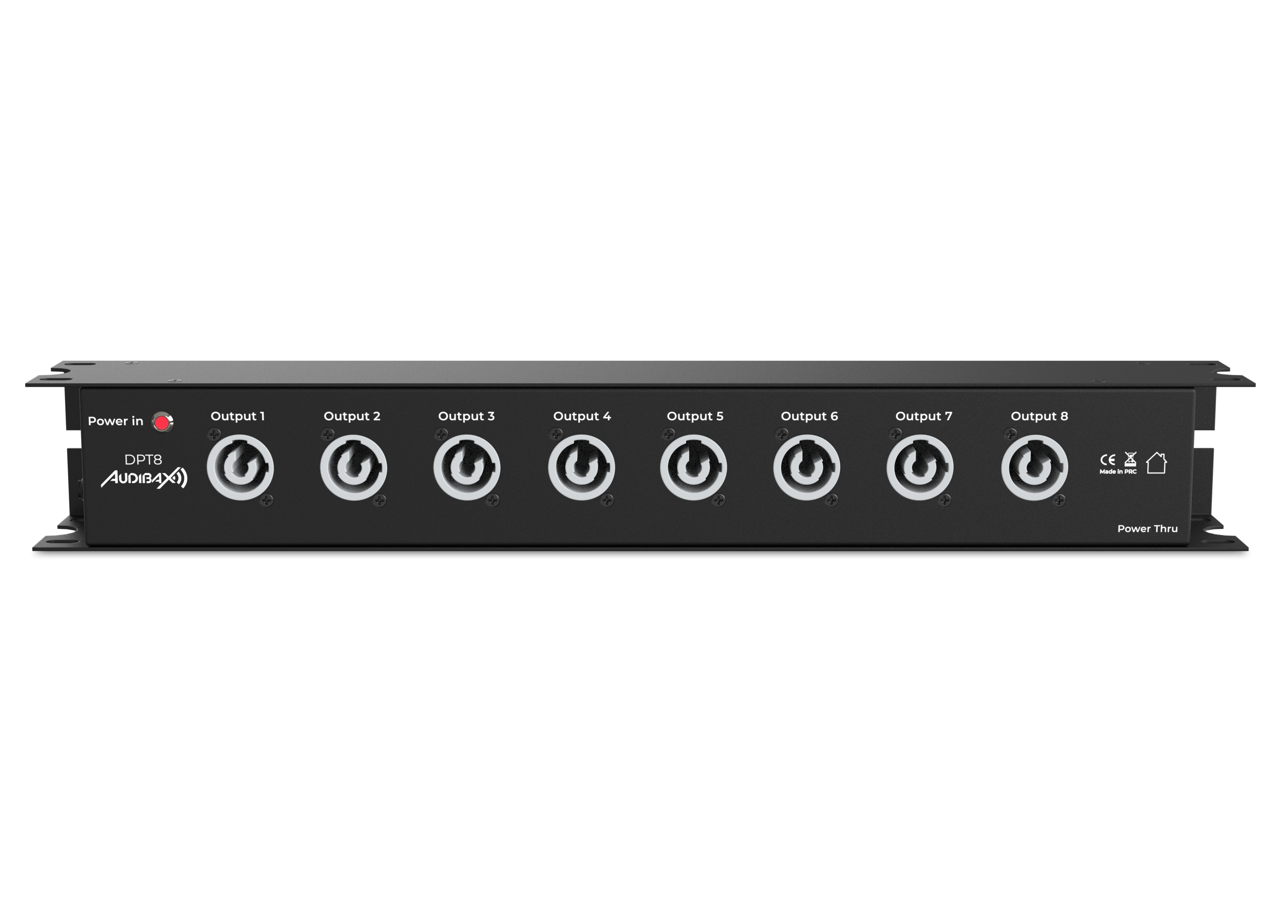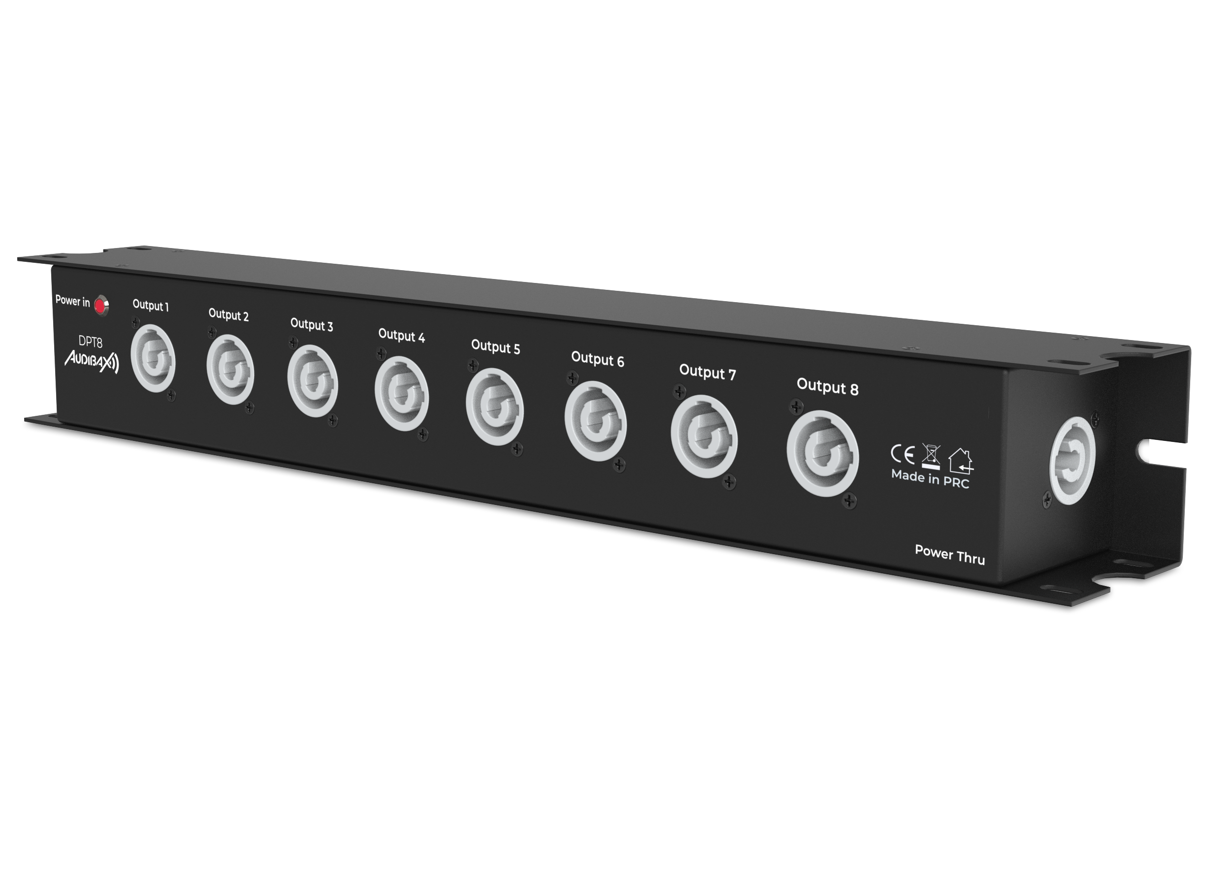 The DPT8 is a professional power strip designed for rack mounting, ideal for audio and lighting installations and technical environments where safe and stable power distribution is required. With 8 outlets plus 1 link and PowerCON connectors (blue input and gray output), it allows for the efficient connection of multiple devices, supporting up to 16 A and 3.5 kW of maximum power. Its rugged metal construction and CE and RoHS certifications ensure safety and durability in professional applications.