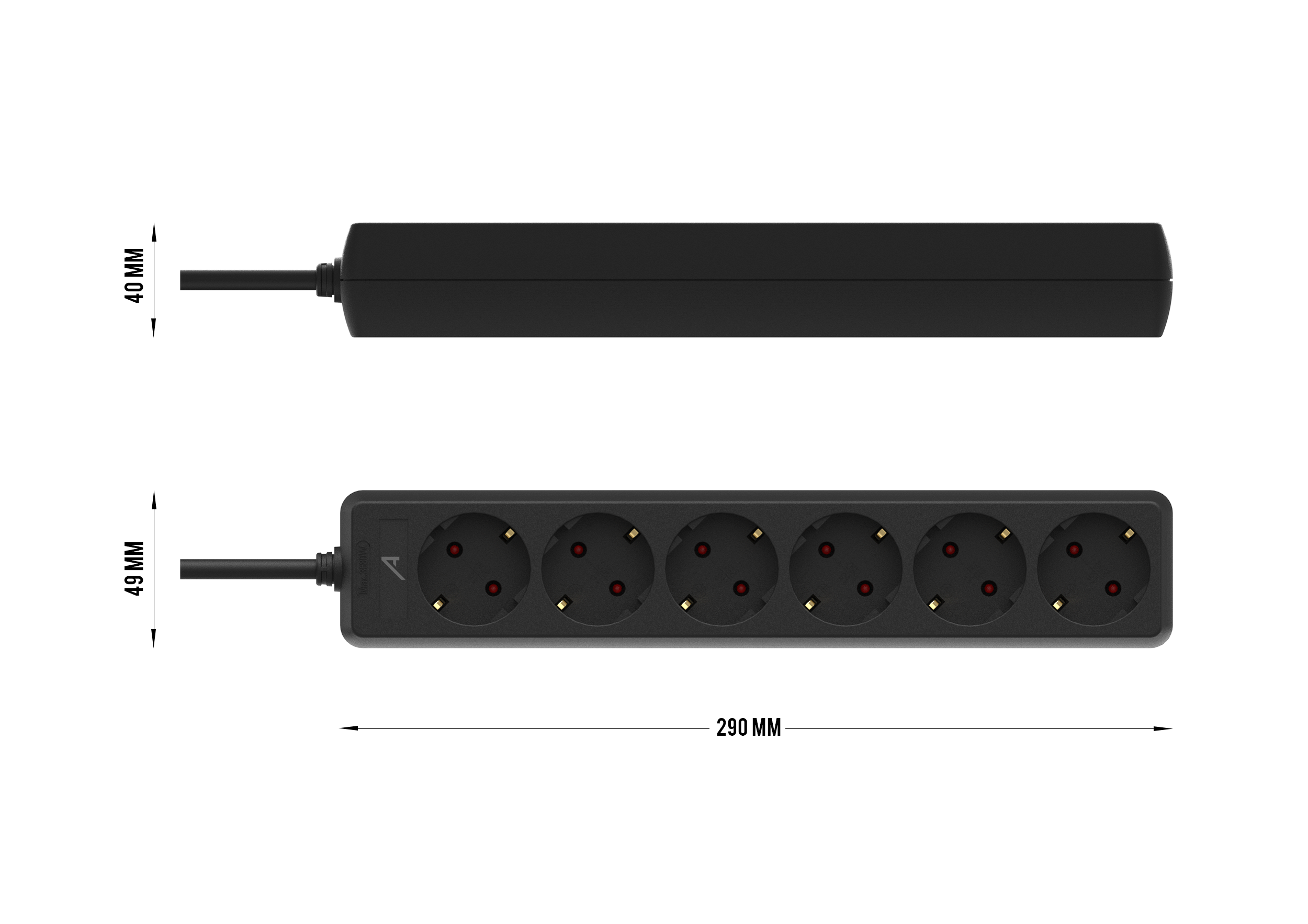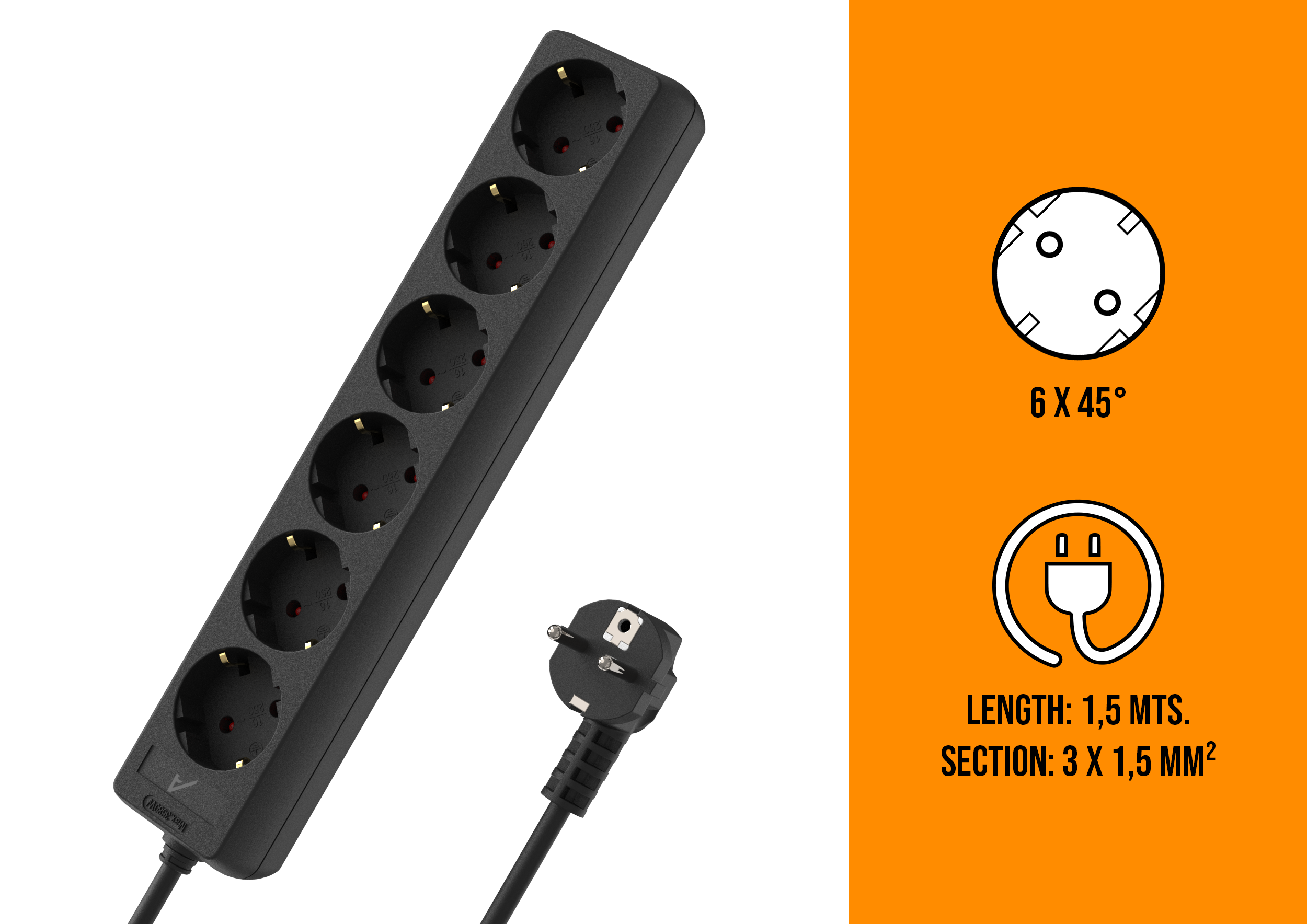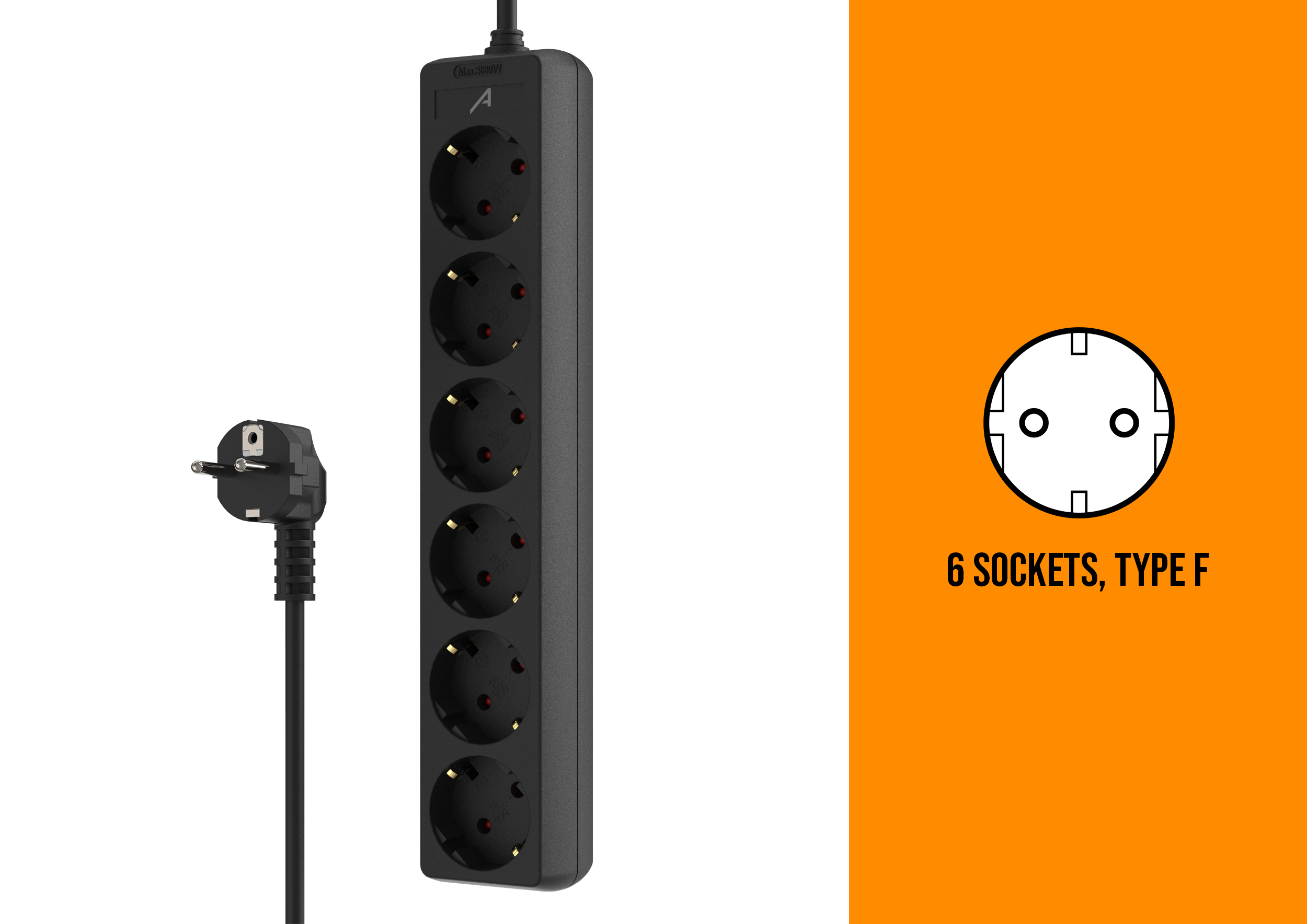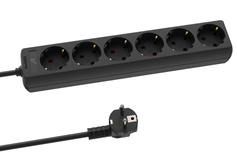 Its standalone design allows it to be used on a desk or flat surface without the need for rack mounting. Equipped with a 1.4 m H05VV-F cable (3 x 1.5 mm²), it supports up to 3680 W, ensuring stable and reliable power supply. The riveted plastic housing provides durability and insulation, with a compact and lightweight design ideal for daily use.